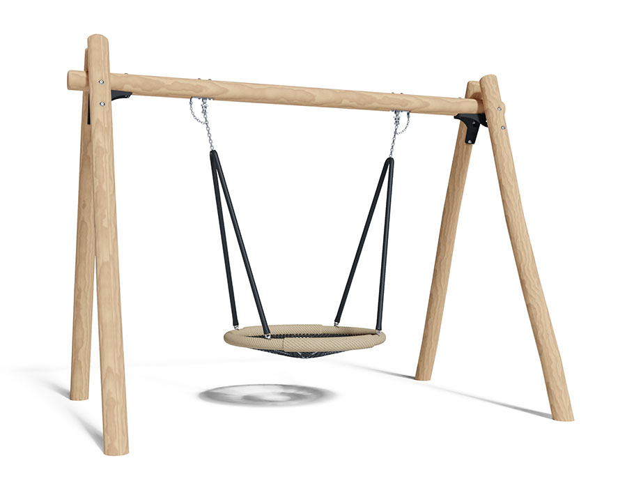 Vogelnestschaukel aus chemisch unbehandeltem Robinienkernholz geschliffen, Aufhängevorrichtung aus Edelstahl, Eckverbinder feuerverzinkt und zusätzlich lackiert nach RAL 7016, mit Vogelnest Huck ø 125 cm, Seilringfarbe beige.