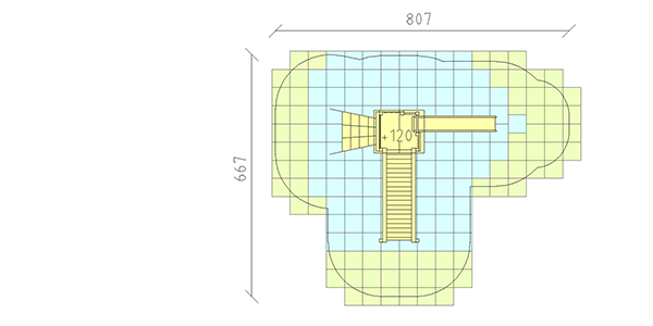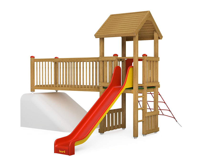 Spielturm-Kombination aus mehrfach verleimtem Schweizer Kiefernholz druckimprägniert, Podesthöhe 120 cm, mit Satteldach, Sprossenaufstieg, Kletternetzaufstieg, Verbindungsbrücke und Rutschbahn aus Polyester rot/gelb, inkl. Stahlfusskonsole für minimale Einbautiefe 50 cm.