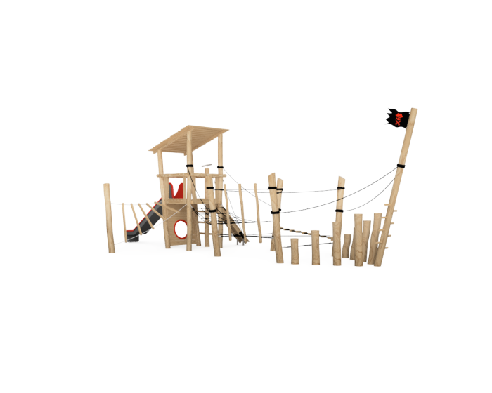 Balancierkahn aus chemisch unbehandeltem Robinienkernholz geschliffen, Podesthöhe 150 cm, mit Pultdach, Sprossenaufstieg, Schrägaufstieg, verdrehte Leiter, Rutschbahn aus Polyester rot/anthrazit und Balancier-Parcours.