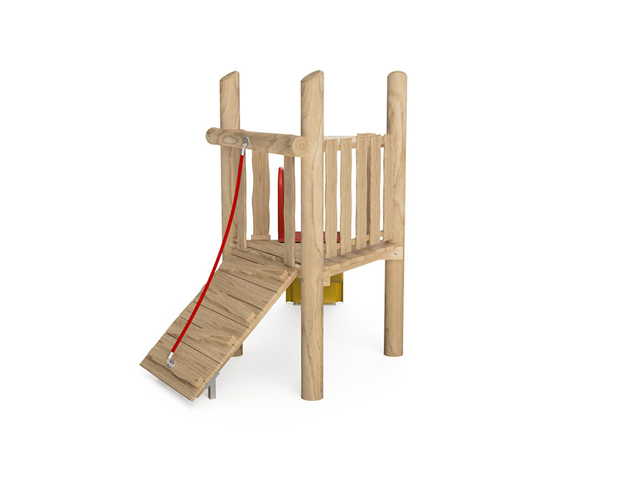 Spielturm-Kombination aus chemisch unbehandeltem Robinienkernholz geschliffen, Podesthöhe 90 cm, mit Schrägaufstieg und Rutschbahn aus Polyester rot/gelb.