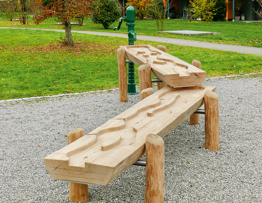 Wasserrinne aus Douglasie sägeroh und unbehandelt, Auflager in Edelstahl, mit Robinienholzpfosten zum direkt einbetonieren, für minimale Einbautiefe 44 cm.