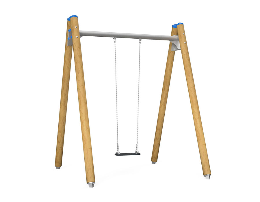 Schaukelgerüst aus mehrfach verleimtem Schweizer Kiefernholz druckimprägniert, Aufhängevorrichtung aus Edelstahl für ein Sitz, Stahlrohr und Eckverbinder feuerverzinkt, inkl. Stahlfusskonsolen für minimale Einbautiefe 50 cm.