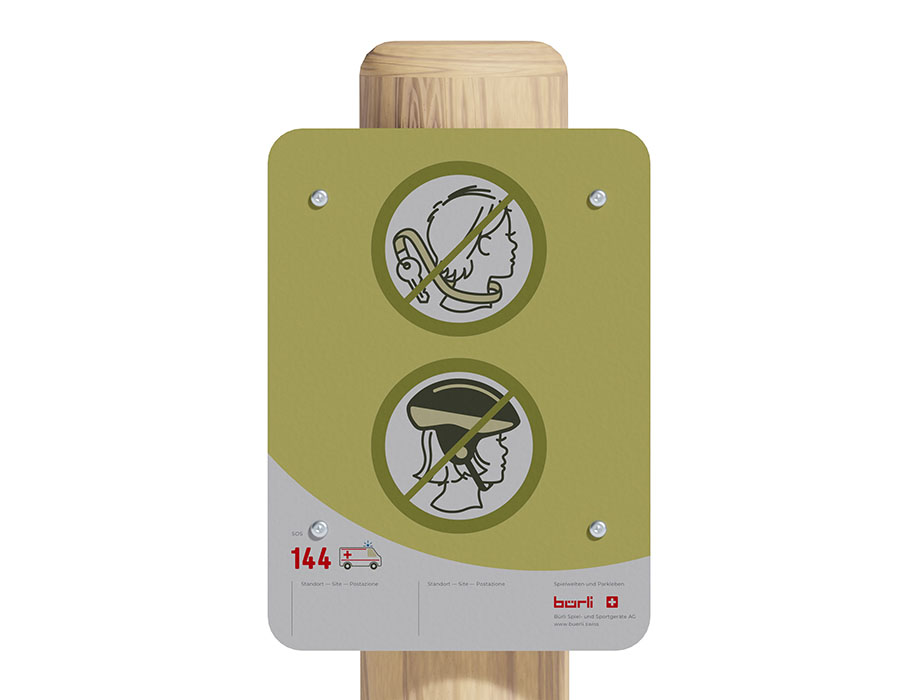 Spielplatztafel Standard aus Aluminium-Verbundplatte, mit zwei Symbolen, Format 220 x 300 mm, Digitaldruck auf weisser Folie, mit Schutzlaminat überzogen, Standmodell mit Pfosten aus chemisch unbehandeltem Robinienkernholz geschliffen.