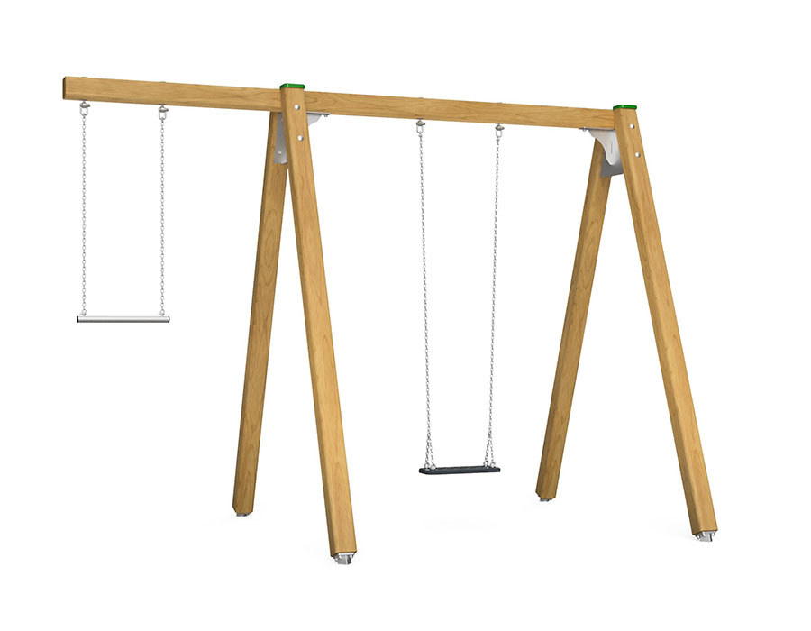 Schaukelgerüst aus mehrfach verleimtem Schweizer Kiefernholz druckimprägniert, mit seitlichem Trapez, Aufhängevorrichtung aus Edelstahl für ein Sitz, inkl. Stahlfusskonsolen für minimale Einbautiefe 50 cm.