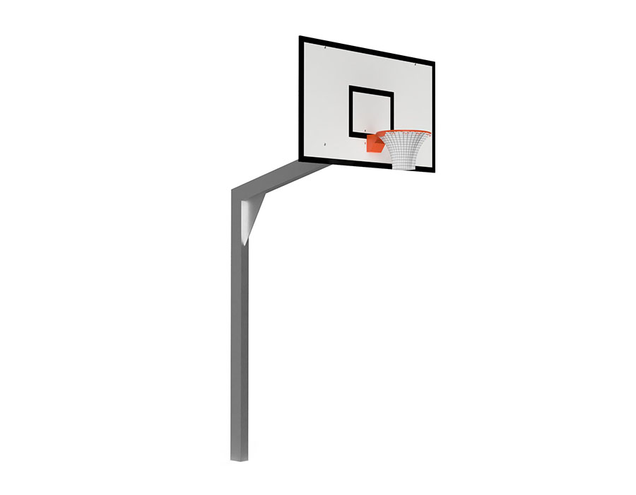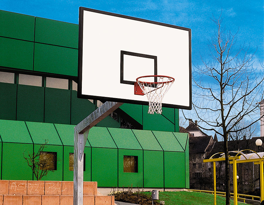 Basketballanlage aus Stahlrohr feuerverzinkt, Ausladung 165 cm, Zielbrett aus Kunstharz Grösse 180 x 105 cm, mit Original-Basketballkorb mit Feder-Element, mit Netz und Bodenhülse, minimale Einbautiefe 80 cm.