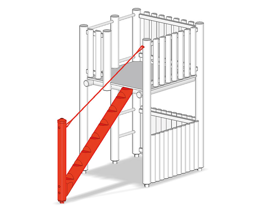 Baumstammaufstieg für Podesthöhe 150 cm, aus verleimtem Schweizer Kiefernholz druckimprägniert, mit Tau als Kletterhilfe.