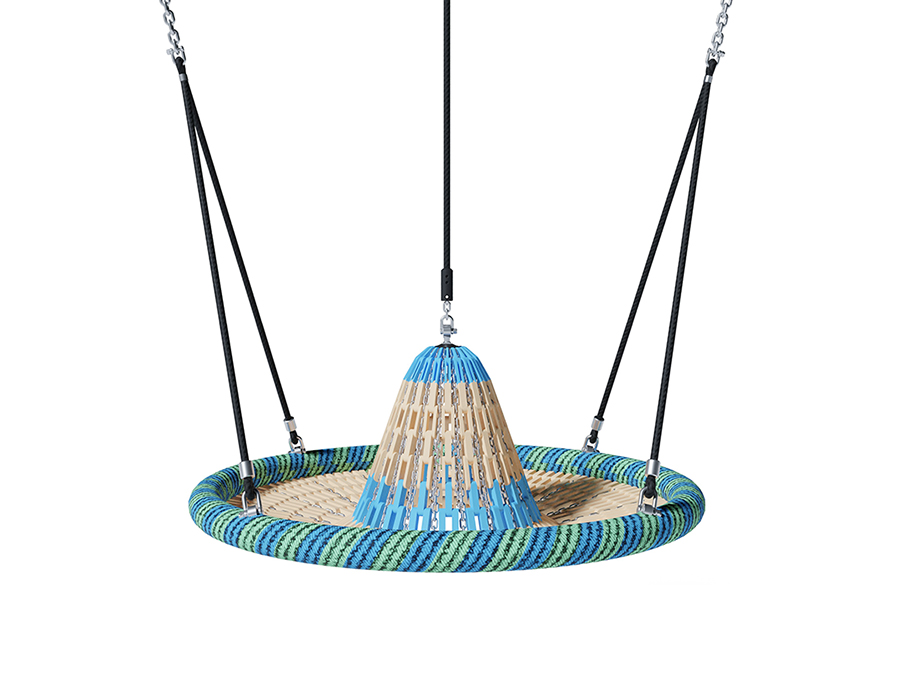 Sombreroschaukel aus mehrfach verleimtem Schweizer Kiefernholz druckimprägniert, Aufhängevorrichtung aus Edelstahl, Stahlrohr und Eckverbinder feuerverzinkt, mit Sombrero-Sitz ø 120 cm, inkl. Stahlfusskonsolen für minimale Einbautiefe 50 cm.