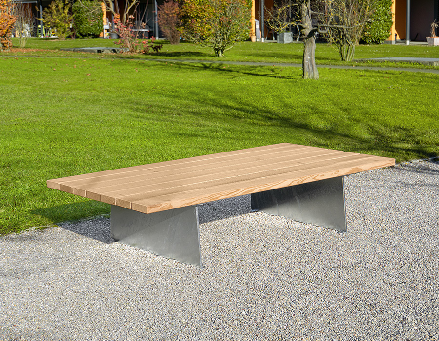 Wide park bench Teret made of raw Swiss larch, length 200 cm, without backrest, brackets made of hot-dip galvanised steel.