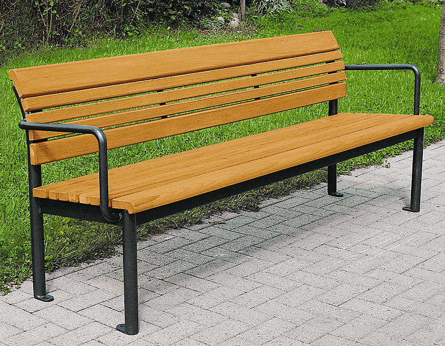 Park bench Ville de Lausanne made of treated Swiss larch, length 180 cm, with backrest and armrest, steel construction hot-dip galvanised and additionally lacquered in patina moderna colour.