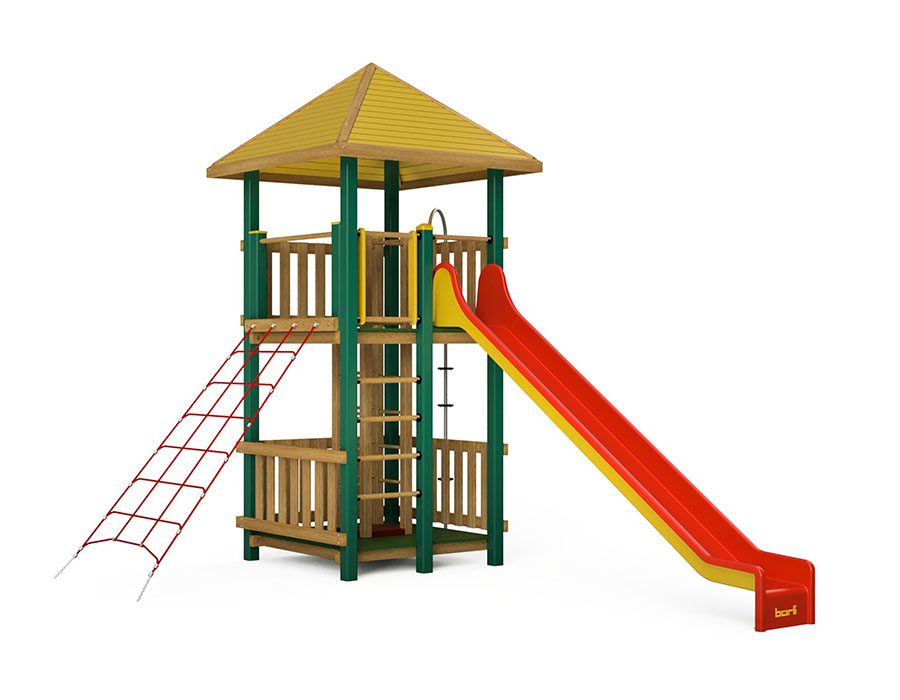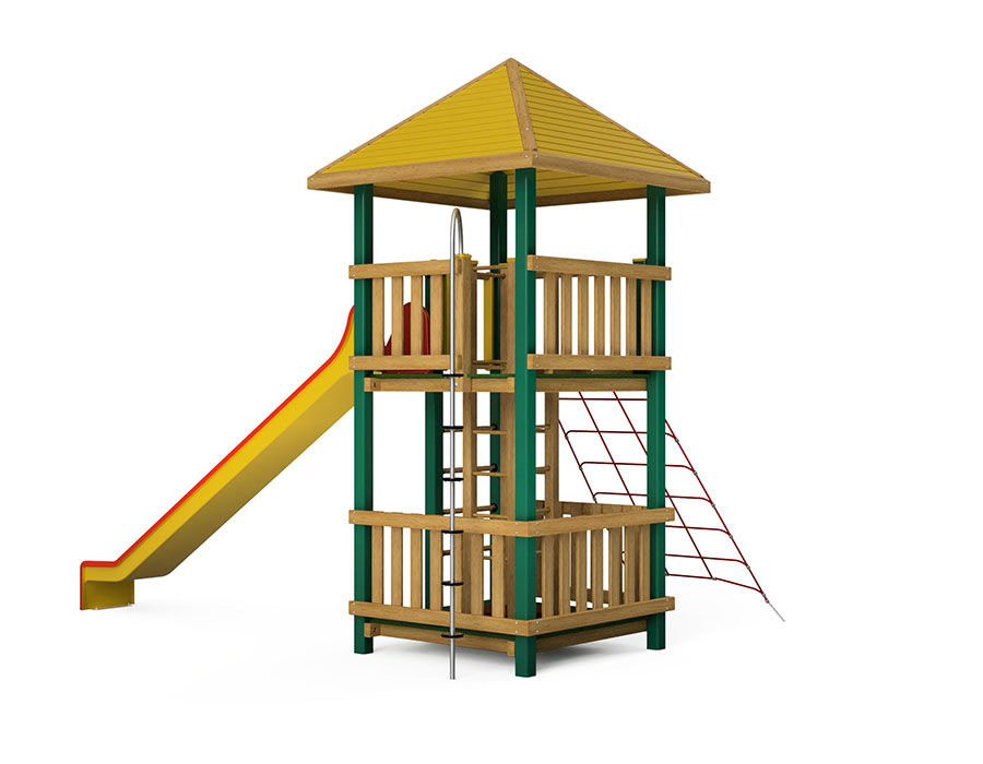 Wood/aluminium playtower combination made of multi-glued Swiss pine, pressure impregnated, pyramid roof with aluminium panelling, posts made of stove enamelled aluminium in RAL 6016 turquoise green, platform heights 25/200 cm, slide made of polyester red/yellow, climbing pole, climbing net ascent, minimum installation depth 50 cm.