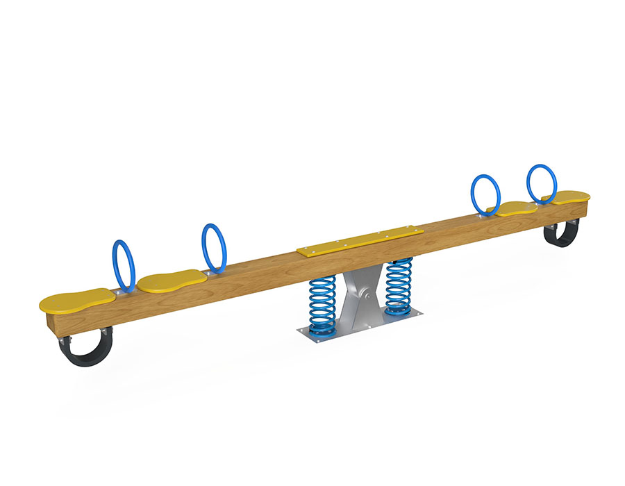 Spring seesaw made of multi-glued Swiss pine, pressure impregnated, substructure hot-dip galvanised, lacquered spiral springs, polyethylene parts are weatherproof, incl. hot-dip galvanised foot frame for minimum installation depth 50 cm.