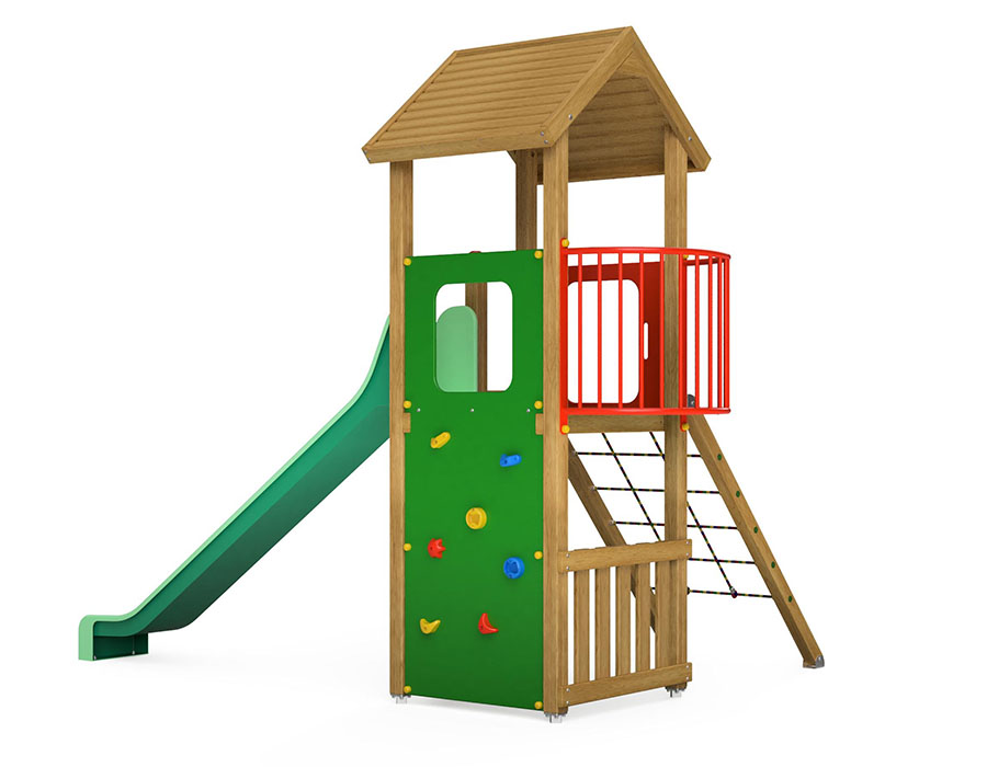 Playtower combination made of multi-glued Swiss pine, pressure impregnated, platform height 150 cm, with gable roof, rung ascent, climbing wall, balcony, climbing net section and slide made of polyester green/green, incl. steel foot bracket for minimum installation depth 50 cm.