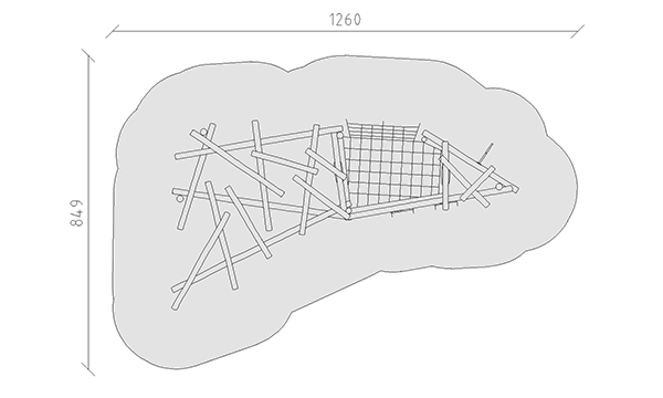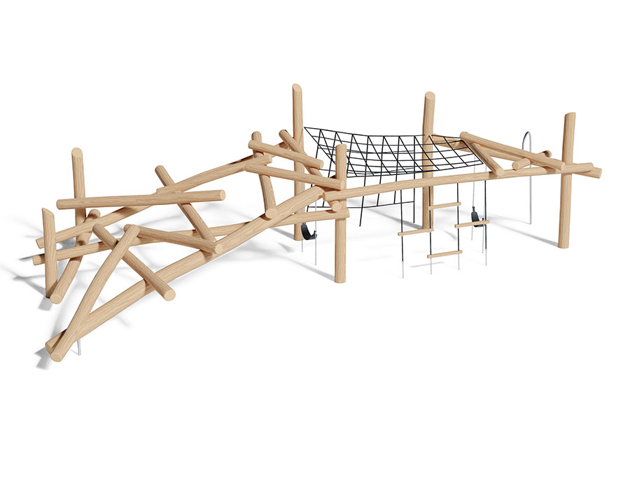 Climber II made from chemically untreated robinia heartwood, steel-reinforced mammoth ropes, black colour, with Mikado climb, net canopy, climbing net, rung climb, fireman's pole and belt seats.