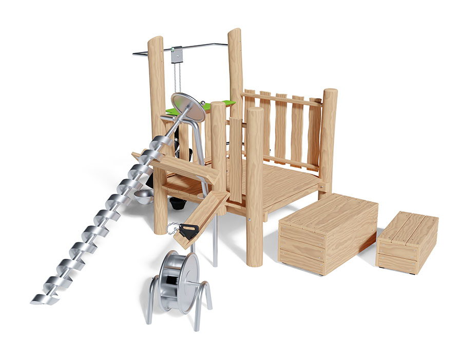 Sand and water playtower made of chemically untreated sanded robinia heartwood, platform height 55 cm, climb with boxes, push crane, chute, stainless steel sand funnel, stainless steel sand level, water spiral, V-gutters with slide and stainless steel water wheel, minimum installation depth for natural fall protection 80 cm / synthetic 60 cm.