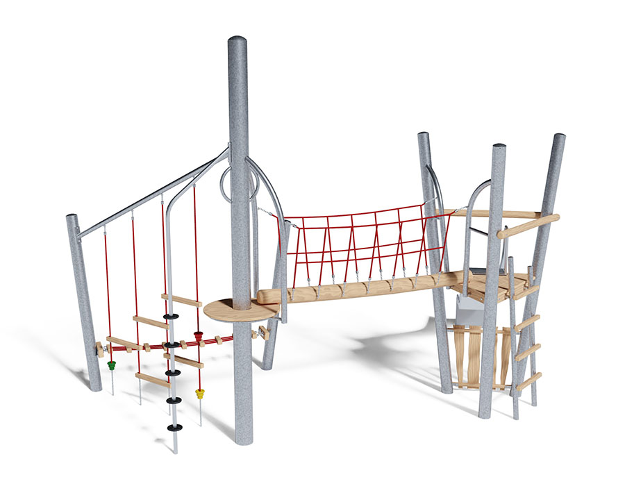 Balancing trail made of hot-dip galvanised steel tubing, with playtower platform height 150 cm, slide made of stainless steel, suspension devices made of stainless steel, mammoth ropes steel-reinforced, wooden elements made of chemically untreated Robinia heartwood, sanded.