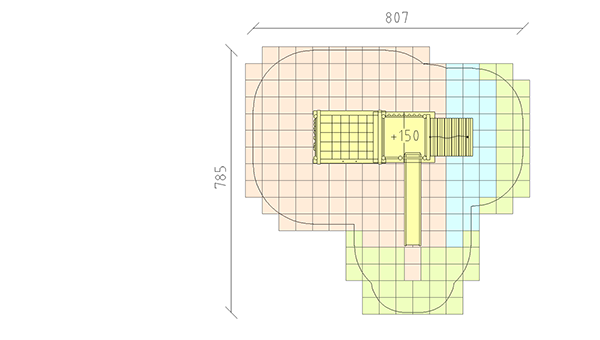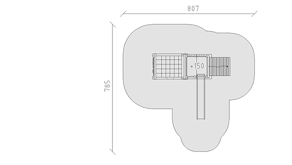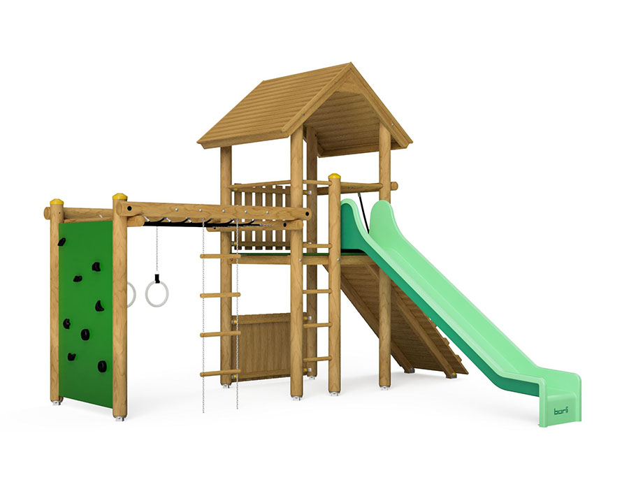 Playtower combination made of multi-glued Swiss pine, pressure impregnated, platform height 150 cm, with gable roof, slide made of polyester green/green, inclined ramp and combi gymnasts extension with climbing wall, incl. steel foot brackets for minimum installation depth 50 cm.