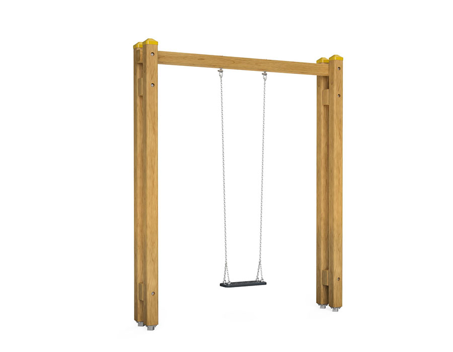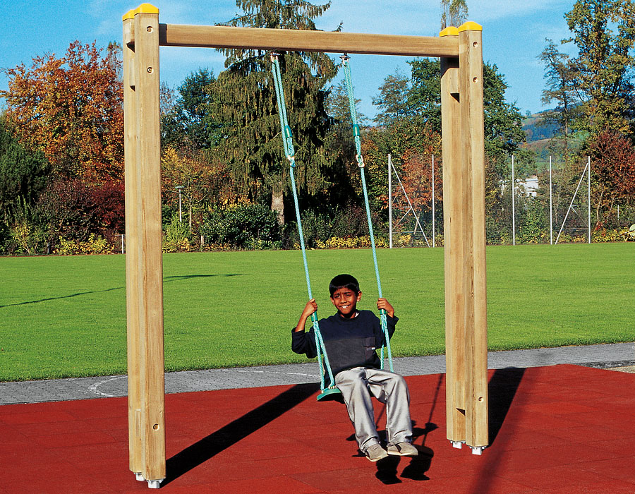 Swing frame made of multi-glued Swiss pine, pressure impregnated, stainless steel suspension device for one seat, incl. steel foot brackets for minimum installation depth 50 cm.