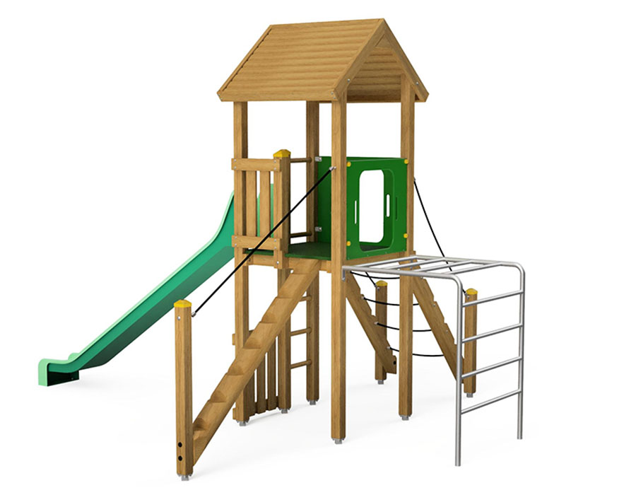 Play tower combination made of multi-glued Swiss pine, pressure-treated, platform height 150 cm, with pitched roof, tree trunk access, metal climbing ladder, combination access and slide made of polyester green/green, incl. steel base bracket for minimum installation depth of 50 cm.
