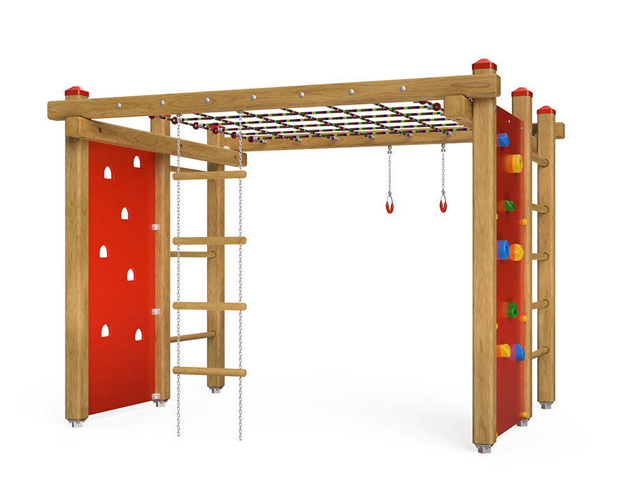 Combi-Gymnaste en bois de pin Suisse collé et imprégné sous pression, espalier, deux murs d'escalade, ciel en filet de noeds, anneaux de gymnastique avec châines d'acier inoxydable, échelle avec chaînes, inclus pieds galvanisés à chaud avec profondeur de montage minimum 50 cm.