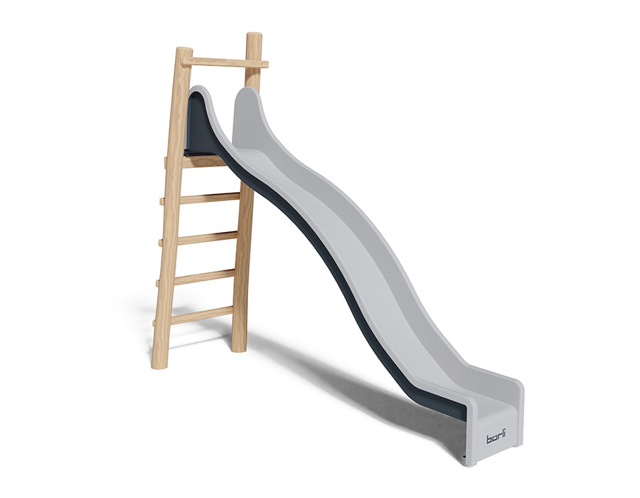 Toboggan avec escalier en bois de robinier meulé et chimique non traité, hauteur de plate-forme 180 cm, avec toboggan en polyester en couleur grise/anthracite, longueur de glissoire 360 cm.