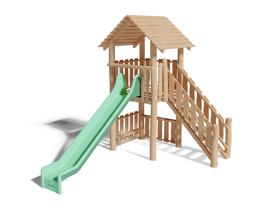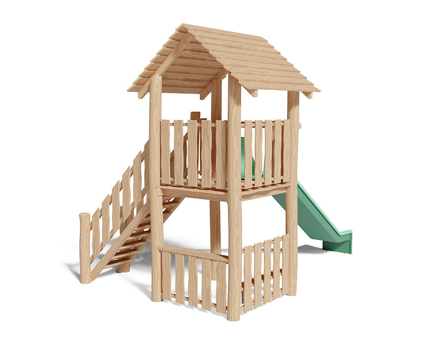 Ensemble de jeux en cœur de bois de robinier non traité chimiquement, hauteur de la plate-forme 150 cm, avec toit à deux versants, escalier d’accès, banc en garde-corps et toboggan en polyester vert/vert.
