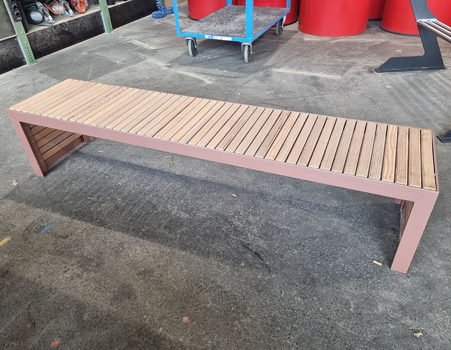 Banc de parc en bois de mélèze Suisse traité, longueur 200 cm, sans dossier, construction en acier galvanisé à chaud et peint en VAG E8.