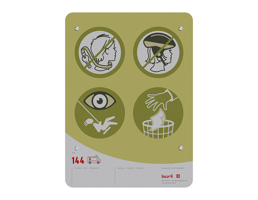 Indication de la norme Selon la norme SN EN 1176-7:2018 des panneaux indicateurs doivent être posés aux aires de jeux, qui signalent des situations dangereuses possibles. Les deux symboles « interdiction de port de casque et interdiction de port de cordon » sont obligatoires et ne peuvent donc pas être modifiés.