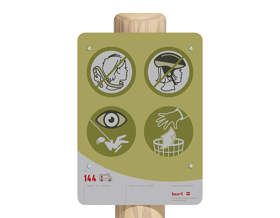Indication de la norme Selon la norme SN EN 1176-7:2018 des panneaux indicateurs doivent être posés aux aires de jeux, qui signalent des situations dangereuses possibles. Les deux symboles « interdiction de port de casque et interdiction de port de cordon » sont obligatoires et ne peuvent donc pas être modifiés.
