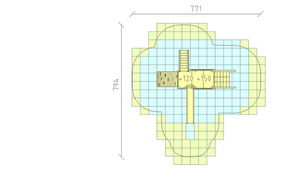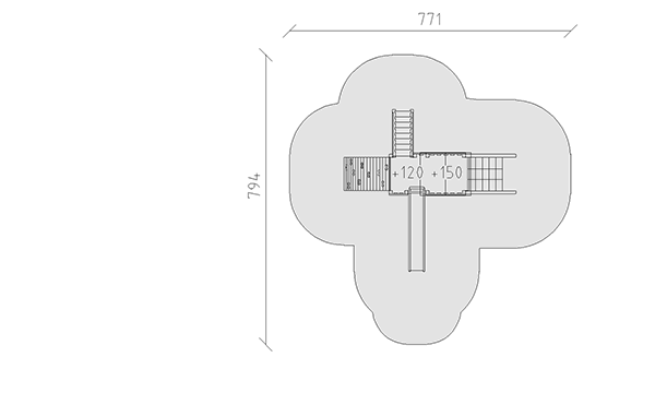Ensemble de jeux en bois de pin Suisse collé et imprégné sous pression, hauteur des plates‐formes 120/150 cm, avec toit à deux versants, secteur filet à grimper, escalier, mur d'escalade arqué et toboggan en polyester rouge/jaune, pour profondeur de montage minimum 50 cm.