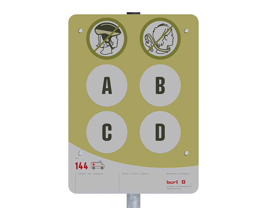 Indication de la norme Selon la norme SN EN 1176-7:2018 des panneaux indicateurs doivent être posés aux aires de jeux, qui signalent des situations dangereuses possibles. Les deux symboles « interdiction de port de casque et interdiction de port de cordon » sont obligatoires et ne peuvent donc pas être modifiés.