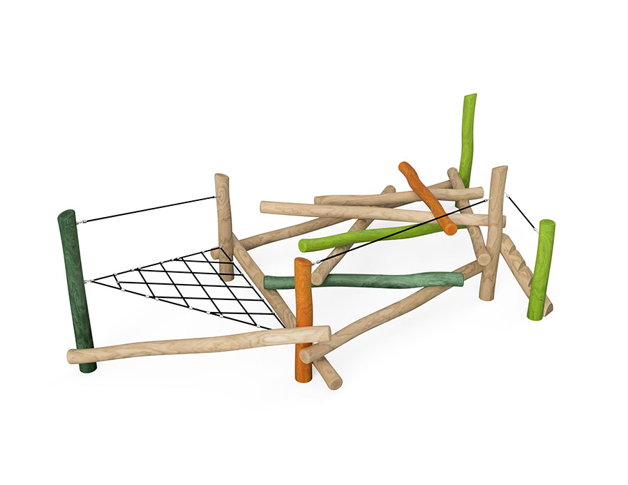 Parcours d'équilibre glacé en bois de robinier meulé et chimique non traité, glacé de couleur supplémentaire, dispositifs de suspension en acier inoxydable, corde de mammut armé d'acier.