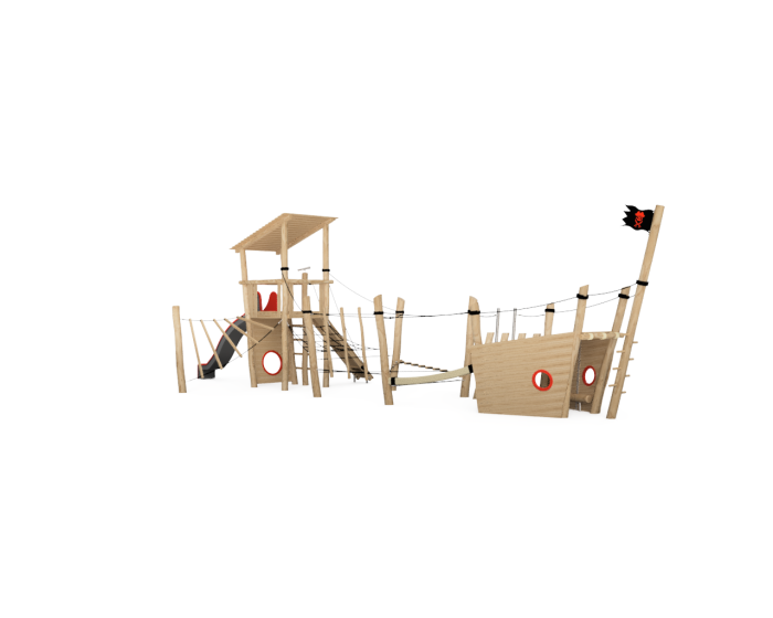 Radeau d’équilibre en cœur de bois de robinier non traité chimiquement, hauteur de plate-forme 180 cm, avec toit en appentis, échelle, plan incliné, échelle inversée, toboggan en polyester rouge/anthracite et parcours d’équilibre.