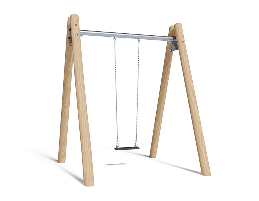 Construction de balançoire en bois de robinier meulé et chimique non traité, dispositifs de suspension en acier inoxydable pour un siège, poutre horizontale et joints angulaires en acier galvanisé à chaud.