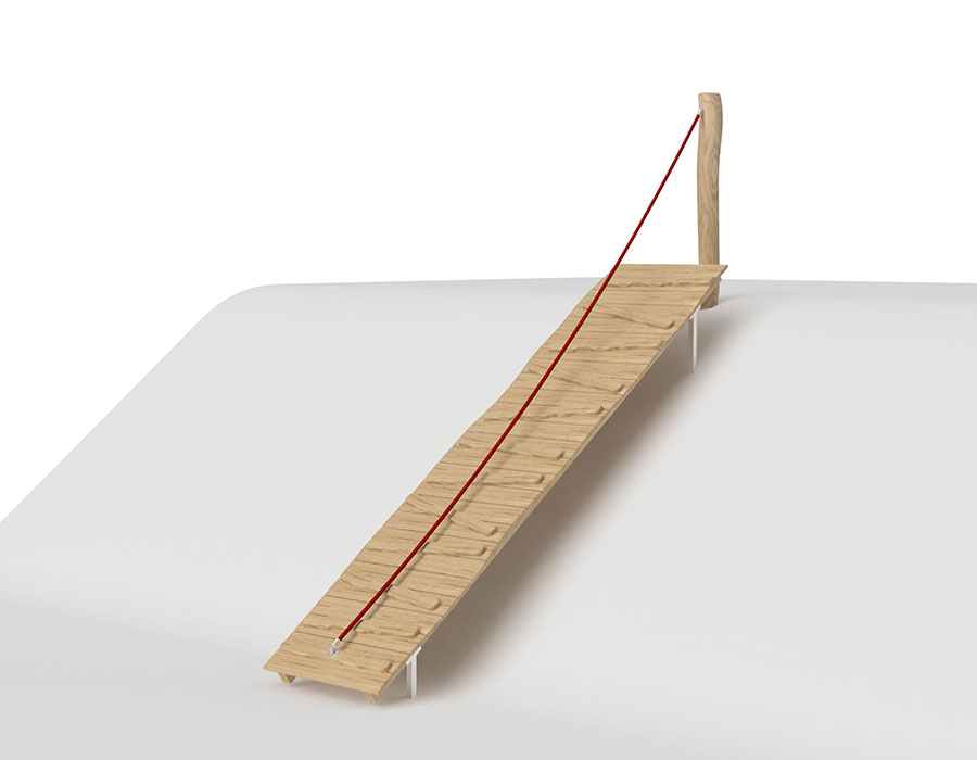 Rampe à grimper en bois de robinier meulé et chimique non traité, pour dénivellation 240 cm, dispositifs de suspension en acier inoxydable, corde de mammut armé d'acier, planches en bois de mélèze Suisse brut.
