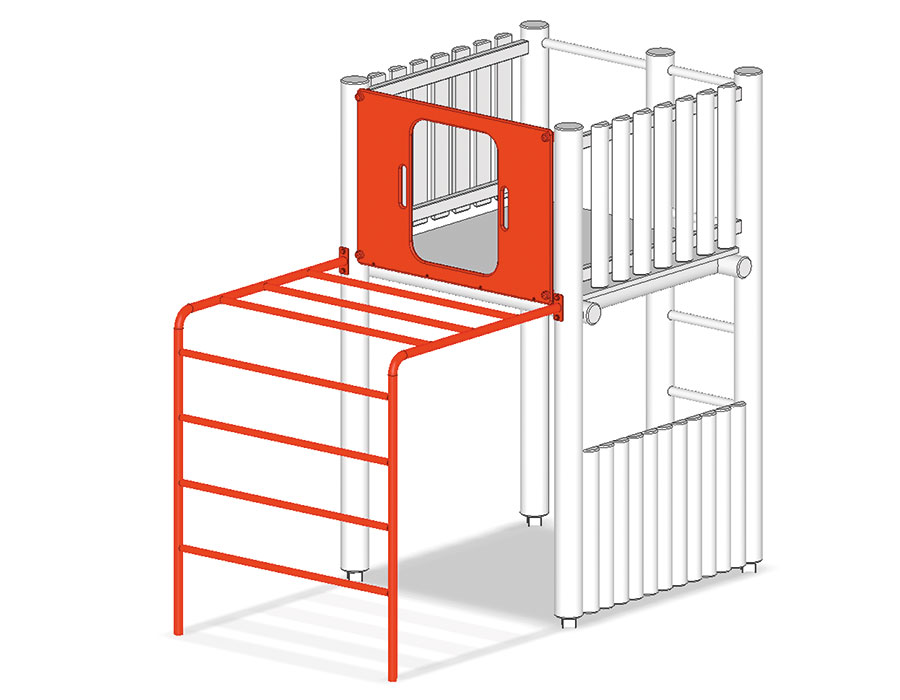 Ensemble de jeux en bois de pin Suisse collé et imprégné sous pression, hauteur de plate‐forme 180 cm, avec toit en pyramide, toboggan ondulé en polyester rouge/jauen, secteur filet à grimper, escalier, banc intégré, partie balançoire, dispositifs de suspension en acier inoxydable pour un siège, inclus pieds galvanisés à chaud avec profondeur de montage minimum 50 cm.