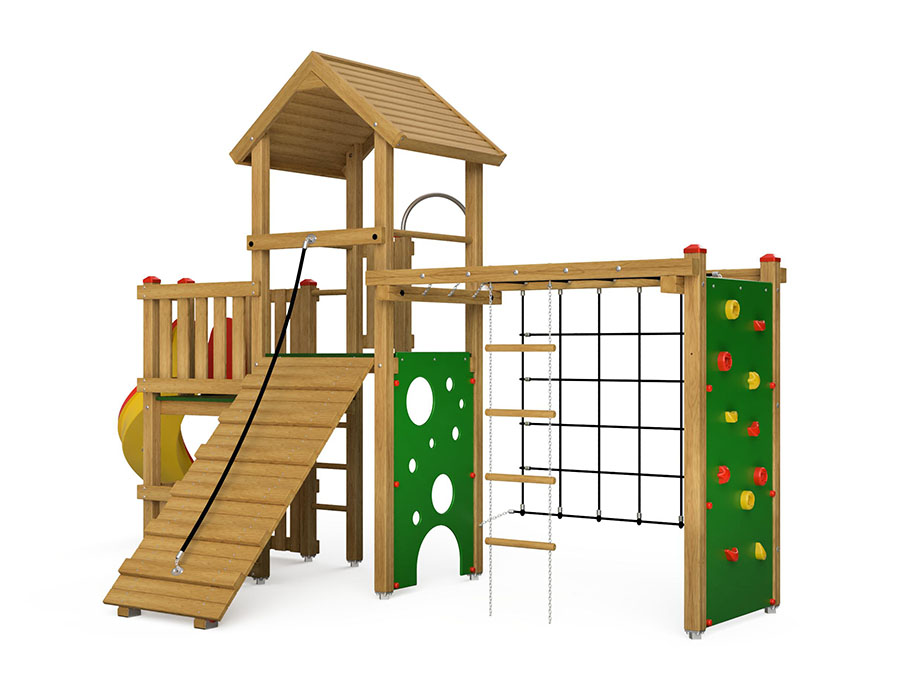 Ensemble de jeux en pin suisse multipli imprégné sous pression, hauteur des plate-formes 120/150 cm, avec toit à deux versants, échelle, rampe d’accès, barre d’escalade et toboggan courbé en polyester rouge/jaune, extension Combi-Gymnaste avec mur d’escalade, filet vertical et horizontal, avec pieds en acier pour une profondeur de montage minimale de 50 cm.