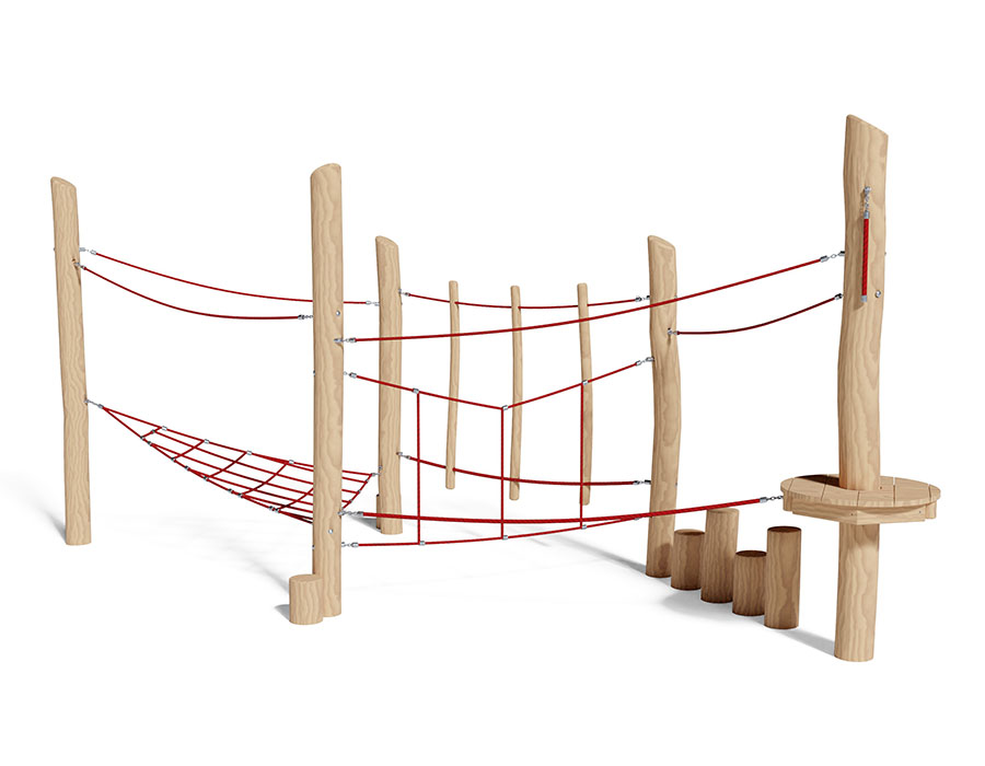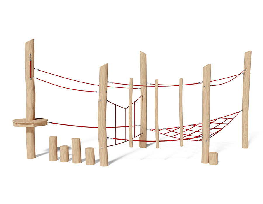 Percorso d'equilibrio fatto di durame di robinia non trattato chimicamente e levigato, dispositivo di sospensione in acciaio inossidabile, corde mammut in acciaio rinforzato.