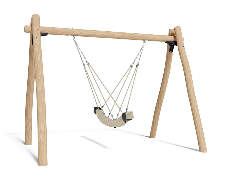 Altalena giungla fatto di durame di robinia non trattato chimicamente e levigato, sospensioni d'acciaio inossidabile, connettore d'angolo galvanizzati a caldo secondo RAL 7016, sedile da giungla in corda intrecciata su 4 lati, profilo 15 x 15 cm.