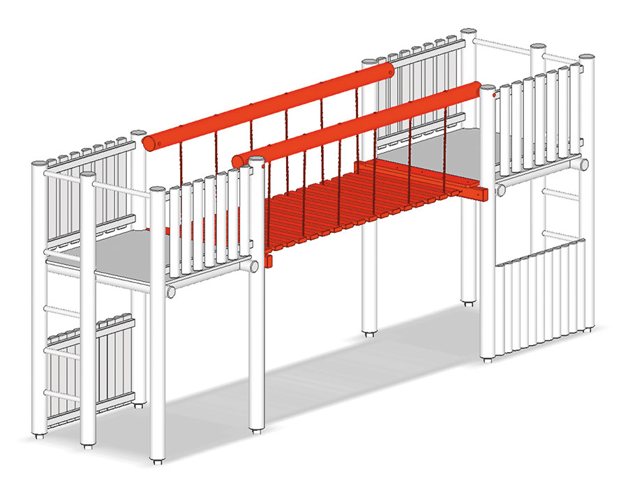 Ponte sospeso per lunghezza 400 cm, in legno di pino svizzero multincollato e impregnato a pressione, con catene zincate a caldo, da torre a torre.