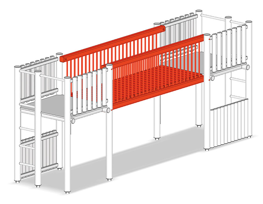 Ponte congiuntivo per lunghezza 400 cm, in legno di pino svizzero multincollato e impregnato a pressione, con due ringhiere da torre a torre.