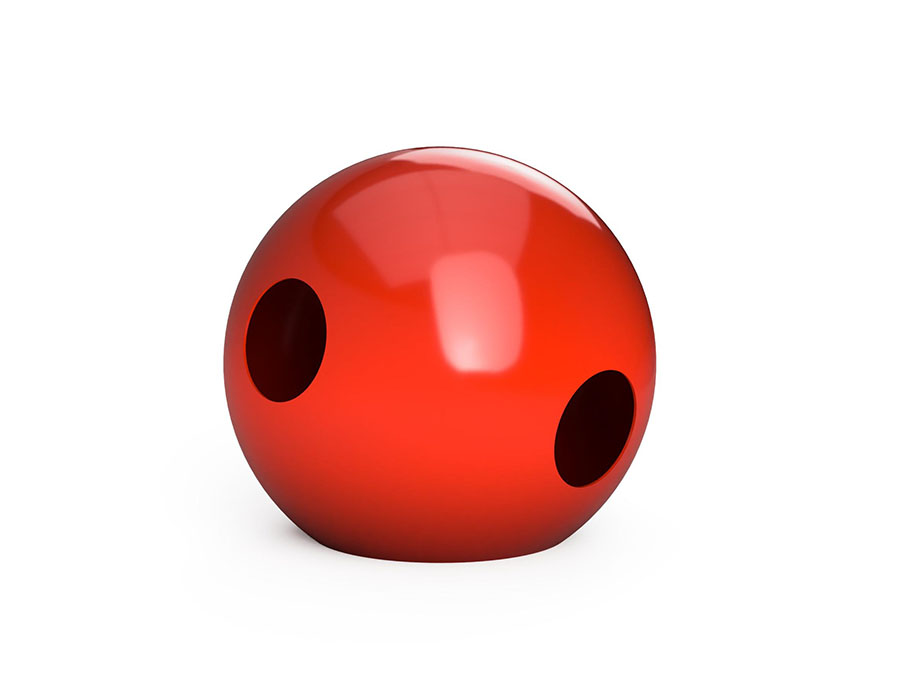 Abitazione globosa di poliestere armato di colore rosso, con pavimento interno e due punti di ingresso.