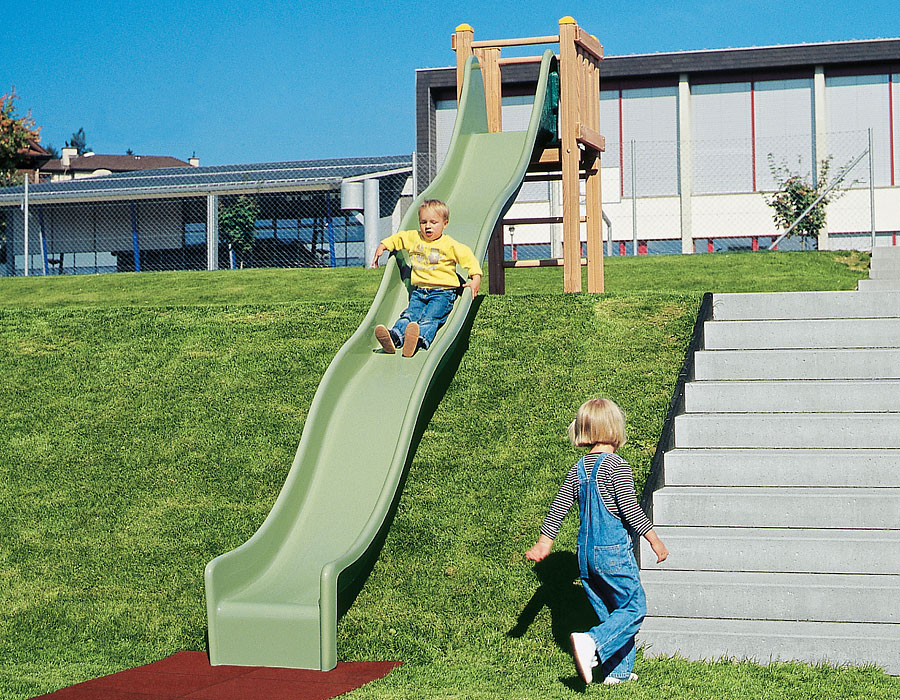 Scivolo ondulato con torre mini in legno di pino svizzero multincollato e impregnato a pressione per altezza di montaggio 245 cm, lunghezza dello scivolo 500 cm, scivolo ondulato di poliestere armato verde/verde, altezza della piattaforma 90 cm, incluso console del piede in acciaio per una profondità di installazione minima di 50 cm.
