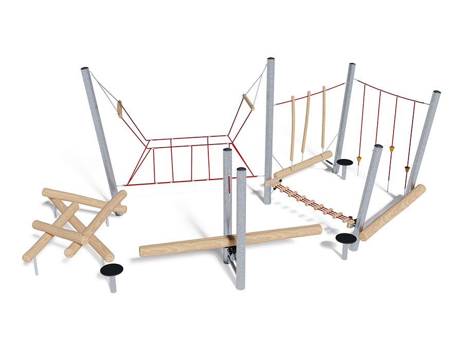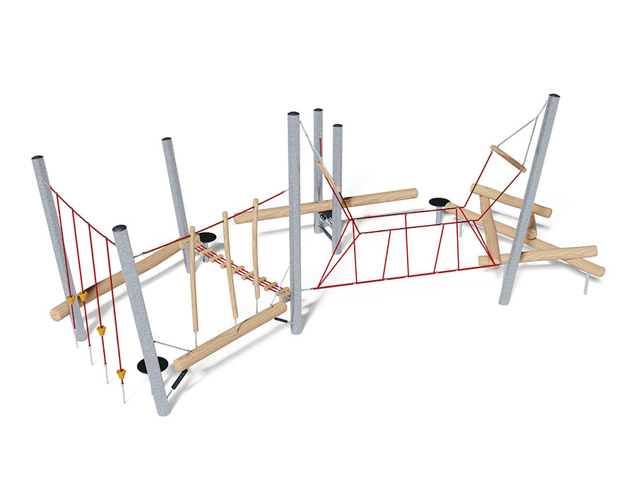 Percorso di equilibrio in acciaio tubolare galvanizzato a caldo, dispositivo di sospensione in acciaio inossidabile, corde mammut in acciaio rinforzato, elementi in legno fatto di durame di robinia non trattato chimicamente e levigato.