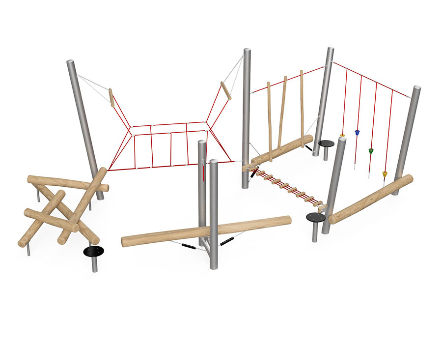 Percorso di equilibrio in acciaio tubolare galvanizzato a caldo, dispositivo di sospensione in acciaio inossidabile, corde mammut in acciaio rinforzato, elementi in legno fatto di durame di robinia non trattato chimicamente e levigato.