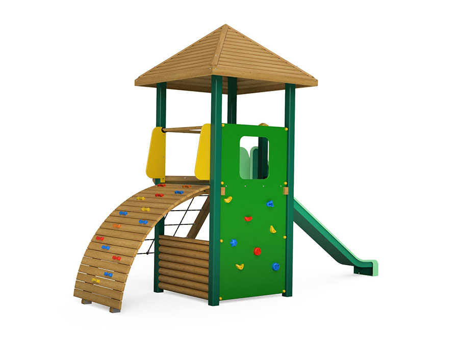 Combinazione di torrete in legno di pino svizzero multincollato e impregnato a pressione, altezza della piattaforma 150 cm, con tetto piramidale, scivolo di poliestere armato, spalliera, ascesa d'arco, rete rampicante di corde et ponte giungla, ascesa di rete rampicante, parete d'arrampicata, incluso console del piede in acciaio per una profondità di installazione minima di 50 cm.