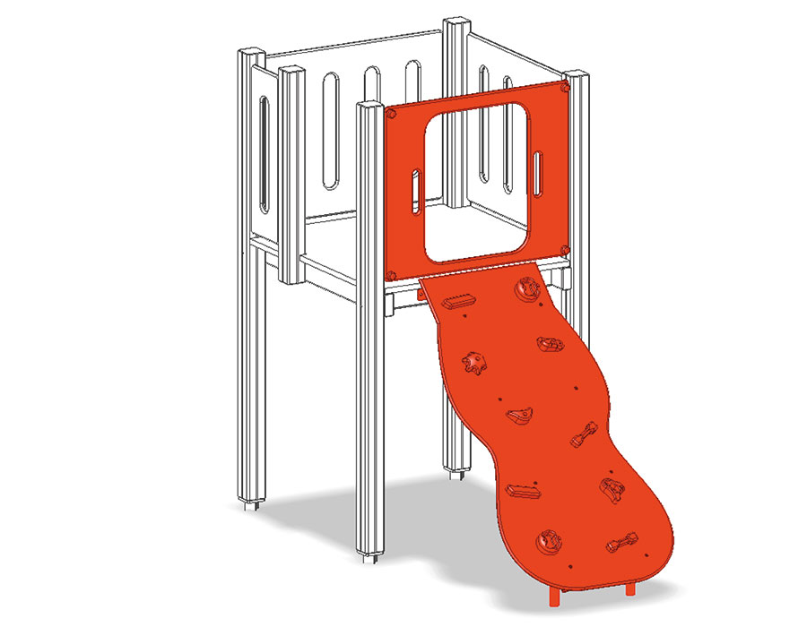 Gioca a torre mini in legno di pino svizzero multincollato e impregnato a pressione, altezza della piattaforma 120 cm, elementi murali di polietilene, con tetto a capanna, scale die nave, panchina e scivolo di poliestere armato rosso/giallo, incluso console del piede in acciaio per una profondità di installazione minima di 50 cm.