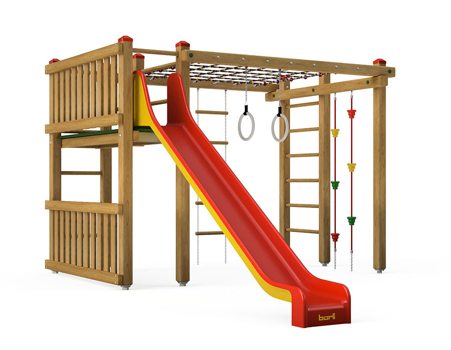 Combi ginnasta con scivolo in legno di pino svizzero multincollato e impregnato a pressione, spalliera, corde rampicante, cielo di rete, anelli di poliammide con catene d'acciaio inossidabile, scala di corda con catene, scivolo di poliestere armato rosso/giallo, incluso console del piede in acciaio per una profondità di installazione minima di 50 cm.