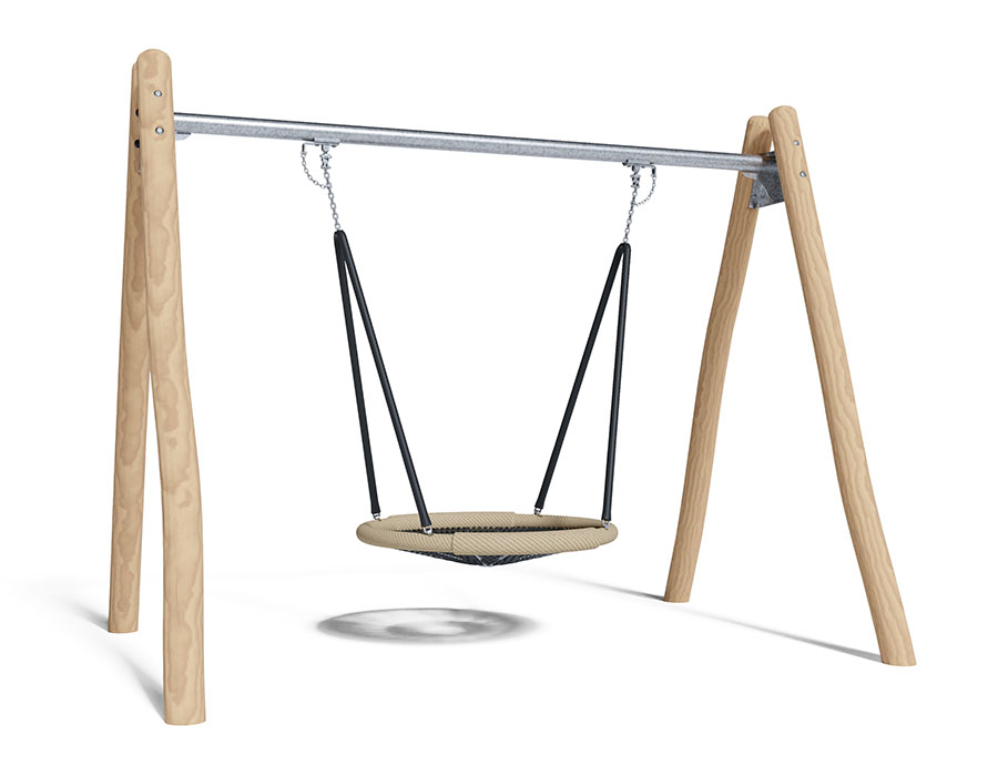 Altalena nido d'uccelli, fatto di durame di robinia non trattato chimicamente e levigato, sospensioni d'acciaio inossidabile, tubo d'acciaio e connettori d'angolo galvanizzati a caldo , con nido d'uccelli Huck originale Ø 125 cm, colore dell'anello di corda beige.