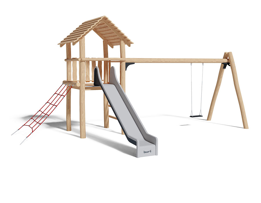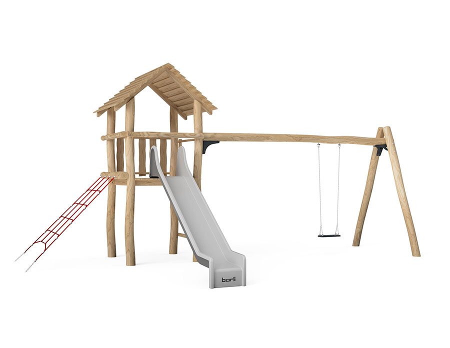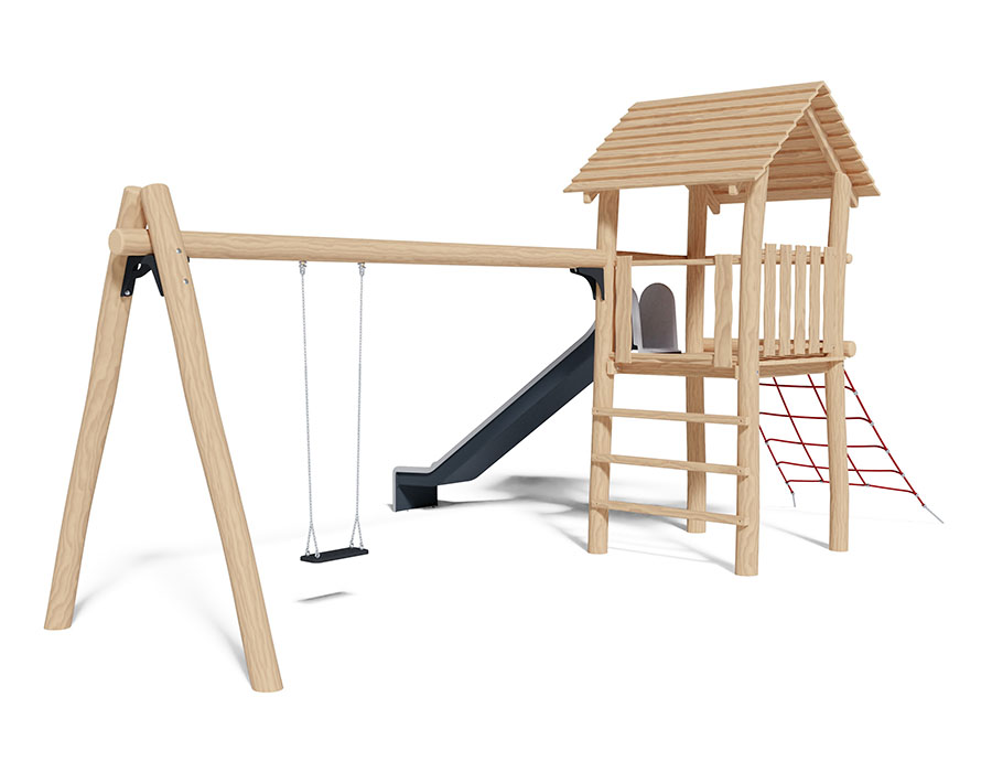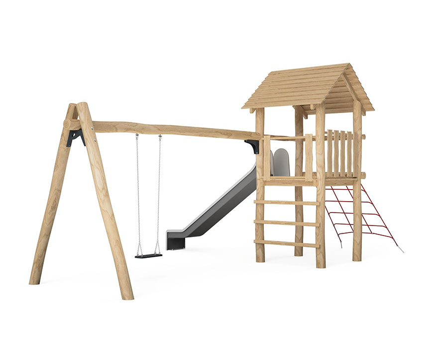 Combinazione di torrete fatto di durame di robinia non trattato chimicamente e levigato, altezza della piattaforma 150 cm, con tetto a capanna e ascesa di piolo, ascesa di piolo, ascesa di rete d'arrampicata, scivolo di poliestere armato grigio/antracite e scomparto per l'altalenaper un seggiolino.