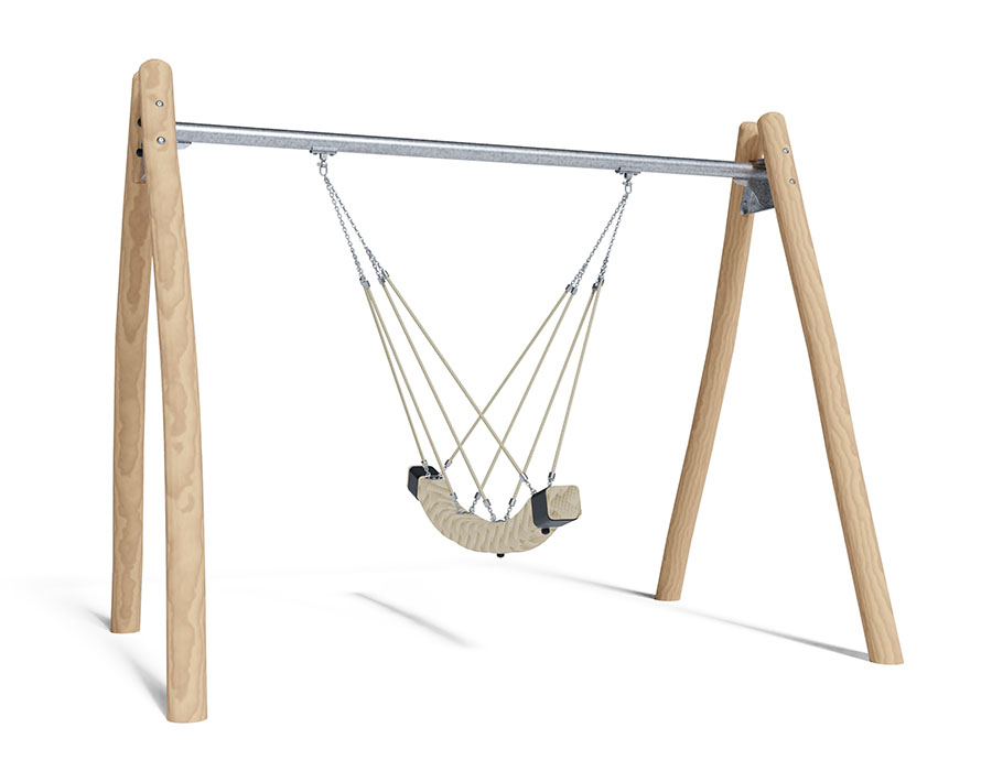 Altalena della giungla in legno di robinia non trattato chimicamente, levigato, dispositivo di sospensione in acciaio inox, tubo trasversale e raccordo angolare in acciaio zincato a caldo, con seggiolino della giungla in corda quadrata intrecciata, profilo 15 x 15 cm.